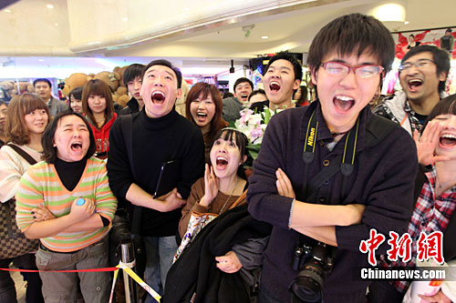 12月12日,北京高校广播联盟组织的2010楼道歌手比赛决赛在西单77街进行。由15所在京高校的500多名选手中脱颖而出的9名选手参加了决赛。同学啦啦队加油助威。中新社发 老罗 摄
