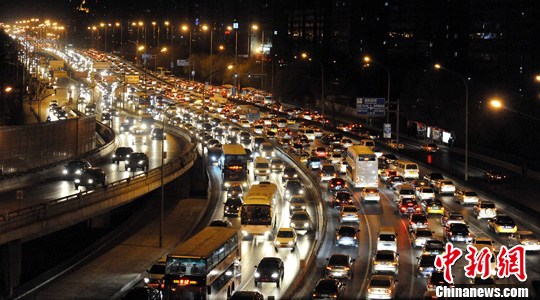 12月14日晚,北京北二环拥堵不堪,车灯形成了一道长虹。12月13日,北京市政府公布了《北京市治理交通拥堵综合措施》。中新社记者 刘震 摄