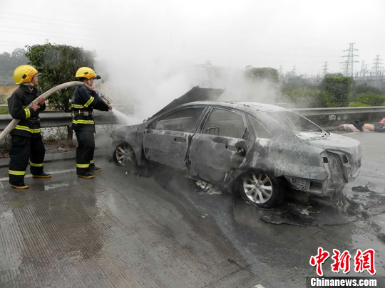 12月14日中午,广西南宁往百色高速上,一小车因雨天路滑撞至路边护栏起火,造成车上6人1死5伤。南宁凤岭消防中队官兵迅速赶至现场救援,最终救出被困人员。 中新社发 林霖 摄