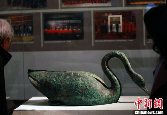 图为展出秦始皇陵陪葬坑出土的青铜天鹅。 中新社记者 孙自法 摄