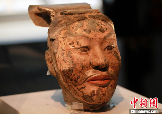 图为展出秦始皇兵马俑博物馆藏、出土于秦兵马俑二号陪葬坑的彩绘俑头。中新社记者 孙自法 摄