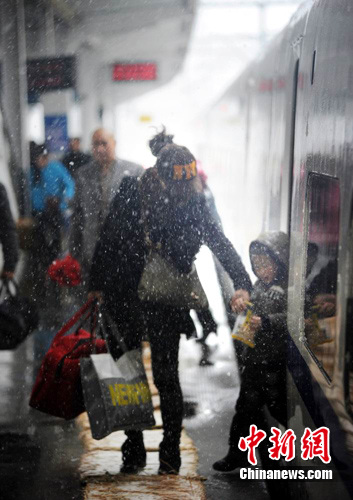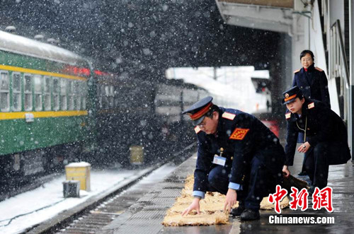 中新网南昌12月15日电(刘占昆 鲍赣生 杨传闽)受强冷空气南下影响,江西省迎来了入冬以来的第一场强降雪。15日下午,在南昌站站台上,铁路职工在清扫积雪并在各站台、候车大厅入口处、出站口等放置400余只草垫,做好旅客的安全防护宣传,引导旅客有序乘车。(完)