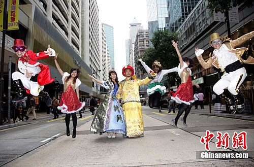 12月15日,戴上面具的舞蹈演员和“中国皇帝”及“西方皇后”,在游人络绎不绝的广东道上劲歌热舞。为24日晚圣诞平安夜街头派对活动预热宣传。中新社发 洪少葵 摄