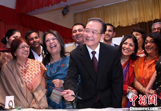 12月15日,正在印度访问的中国总理温家宝参观了泰戈尔国际学校,并现场教印度学生书写“中印友好”四个字。