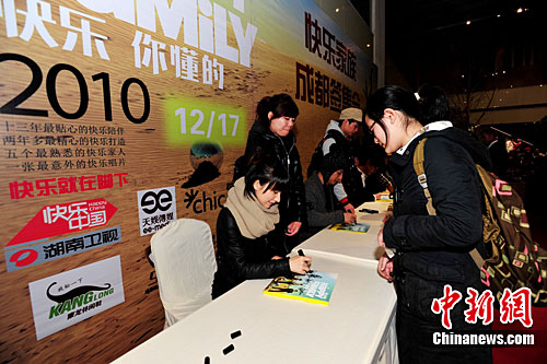 17日下午,“快乐家族”成员何炅、李维嘉、谢娜、吴昕、杜海涛齐齐现身成都,为“快乐家族”首张专辑《快乐你懂的》进行签售,并就此拉开康龙舞步大赛的帷幕。