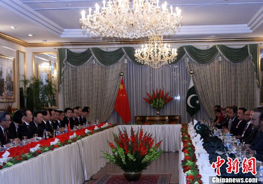 12月17日,中国总理温家宝在伊斯兰堡与巴基斯坦总理吉拉尼举行会谈。中新社记者 周兆军 摄