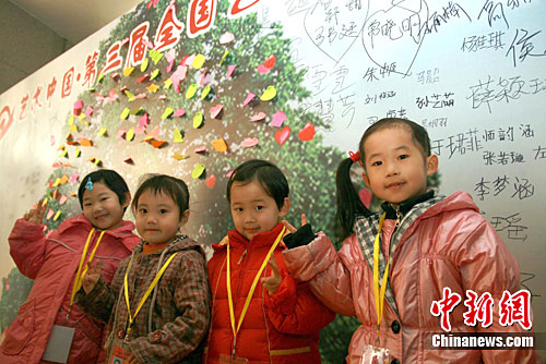 由文化部中国文化管理学会艺术管理专业委员会、中国音乐舞蹈艺术家协会、中国美术书画院等主办的艺术中国·第三届全国艺术新人评选活动已在全国拉开帷幕。12月19日,在河北省石家庄赛区现场,四名年仅3岁的“00后”小选手做出胜利的手势,力争中国艺术新人。据赛事工作者介绍,本届活动吸引了来自河北各地的1000余人参加,这四位小选手是参赛者年龄最小的。中新社记者 翟羽佳 摄