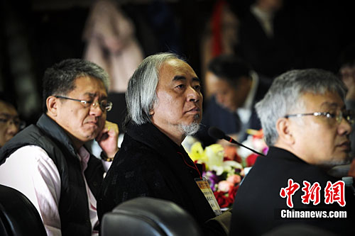 图为海峡两岸民间博物馆文教交流团团长台湾杨英凤美术馆馆长、著名雕塑家杨奉琛(中)在研讨会上。中新社记者 刘震 摄