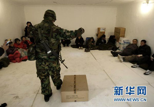 韩国决定20日在延坪岛举行射击演习 12月20日,一名韩国士兵在延坪岛的庇护所向居民解释如何使用防毒面具。韩国军方20日决定当天在延坪岛附近海域举行实弹射击训练。演习将在“北方界线”以南的韩方海域进行。目前,岛上除军队外,还有居民、记者、公职人员等280多人。军方已经通过广播向当地民众下达了紧急躲避令。
