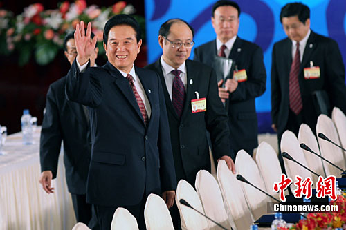 12月21日上午,海协会会长陈云林与海基会董事长江丙坤的两会领导人第六次会谈在台北圆山饭店登场。图为陈云林在落座前向到场采访媒体致意。中新社记者 黄少华 摄