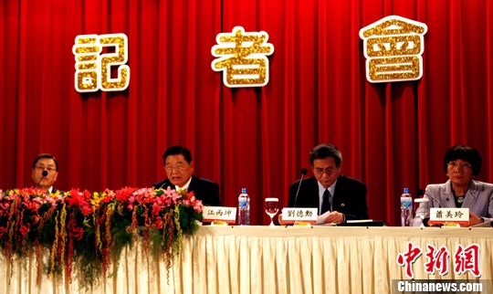 这是自2008年6月两岸两会恢复协商以来签署的第15个两岸合作协议。海基会举行记者会,海基会董事长江丙坤(左二)介绍两岸两会第六次会谈有关情况。