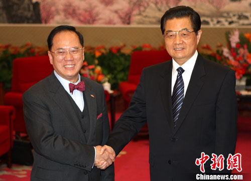 12月22日下午,国家主席胡锦涛在北京中南海会见前来述职的香港特区行政长官曾荫权。 中新社记者 任晨鸣 摄