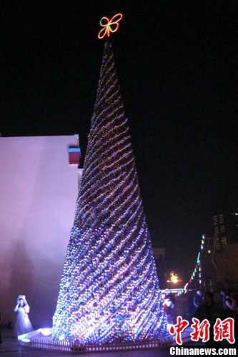12月22日晚,由一万张废旧光盘装饰出的18米高的环保圣诞树正式完工,矗立在长沙世界之窗公园内广场上,吸引众多游人观看。为过一个环保圣诞节,世界之窗今年的圣诞树摒弃了传统的将树砍下装饰成圣诞树的做法,而是将公园内的小树挂上装饰,并且用废旧光盘装饰出巨型环保圣诞树。