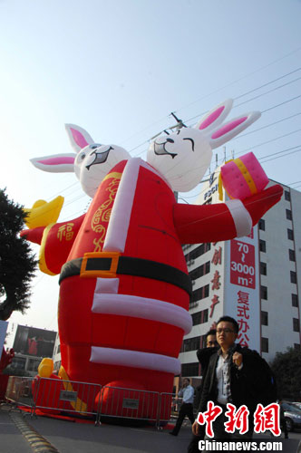 12月22日,一座全球最大充气雕塑兔落户广东佛山创意产业园正门广场,这座高达20米巨型充气雕塑兔,为连身双头,一边身着圣诞装,一边穿着财神服;一手捧礼物,一手托金元宝,分别摆出了鬼脸表情,以一付中西合璧可爱样貌呈现在人们面前,为兔年春节营造气氛。这是著名艺术家舒勇为圣诞、新年、春节而创作的创意春节兔。