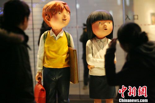 著名绘本作家幾米在内地的首个跨界展览近日在北京开幕。这也是幾米首次在北京办展。展出作品有60件幾米原画作品,幾米等15位艺术家的跨界艺术品,以及台湾设计师为配合场地环境,以幾米绘本中形象为元素特别设计制作的5座户外大型装置。图为以幾米作品为原型的玩偶摆放在北京街头,供游人观赏。