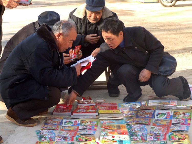 12月24日,河南省滑县老店镇几名农民在集贸市场选购百科知识记事实用农家日历。这些农民认为,这种农历内容丰富,涵盖了24个节气与农业生产和人们生活的相互关系,可以根据时令指导当今农民的农事活动,是新年必购之物。