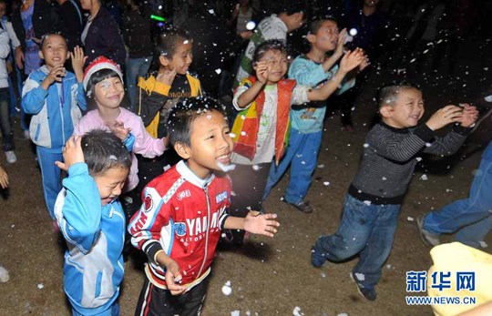 12月24日,孩子们兴奋地在“雪花”中嬉戏。郭程 摄