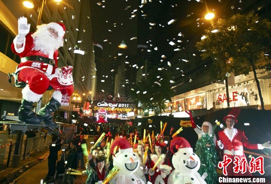 凌晨12:00倒数迎圣诞的一刻,高空烟火效果配合漫天飘雪,8呎高圣诞绅士及圣诞树女郎、趣怪雪人亦到场助庆节日气氛。中新社发 洪少葵 摄