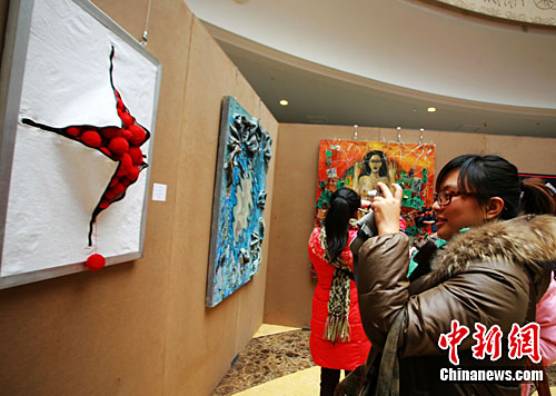 图为师生作品吸引参观者。中新社发 刘忠俊 摄