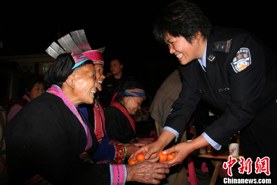 当地瑶胞与民警过“火海”,同歌共舞,祈求幸福平安。金秀瑶族自治县位于广西桂中东部,有盘瑶、茶山瑶、花蓝瑶和山子瑶等5个支系,人口5万余人。