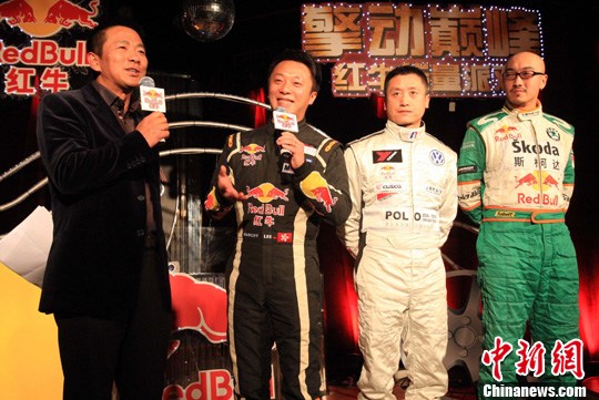 12月29日晚,被誉为“港版舒马赫”的香港首席方程式赛车手李英健(左二)在上海出席“擎动巅峰——红牛能量派对”,李英健回顾获得亚洲保时捷卡雷拉杯赛(PCCA)大赛的年度个人亚军的战绩外,希望以红牛能量超越自我、挑战极限的精神,在新赛季中完美发挥。中新社记者 潘索菲