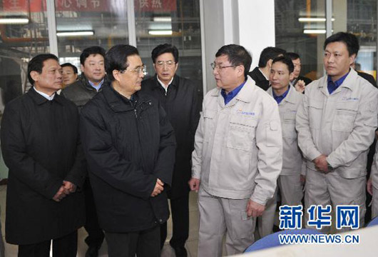 图为胡锦涛在北京市热力集团方庄供热厂生产车间,详细了解企业冬季保障供热情况。新华社记者 黄敬文 摄