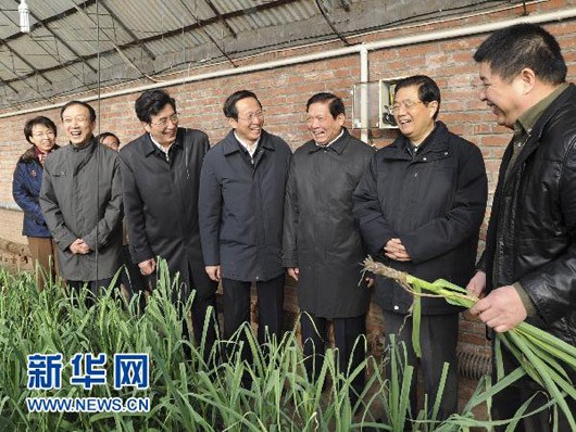 图为胡锦涛在北京金福艺农农业科技发展有限公司的温室大棚,实地察看蔬菜生产情况。新华社记者 李学仁 摄