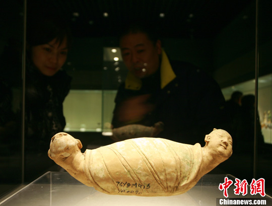 图为宋代双头人面首蛇身卧姿陶俑吸引民众驻足欣赏。中新社发 刘忠俊 摄
