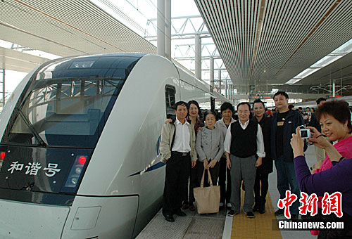 12月30日,海南东线环岛高速铁路建成通车。海南东环高铁投资逾200亿元人民币,是海南迄今投资最大的项目。东环高铁全长308公里,北起海口,途经文昌、琼海、万宁、陵水,南至三亚,最高运行速度为每小时250公里。初期开行动车组10对,海口到三亚全程1小时22分,较高速公路平均行车时间3小时缩短一半。图为30日上午11时5分,首列从海口出发的D7301次列车抵达三亚火车站后,乘客争相与动车组合影。中新社记者 尹海明 摄