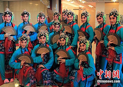新年临近,台湾国光剧团跨年档期策划了主题为“喜剧京典 欢乐百分百”的四场喜剧演出。12月31日倒数时分将有15对真假潘金莲、武大郎陪台北戏迷热闹过新年,名伶魏海敏(后右四)更是将梅、尚、程、荀派四唱腔融于一曲牌,吸引大批戏迷捧场。中新社记者 关向东 摄