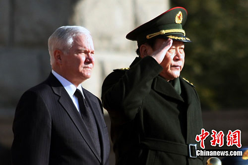 1月10日上午,国务委员兼国防部长梁光烈上将,在北京八一大楼为来华访问的美国国防部长盖茨举行欢迎仪式。中新社记者 宋吉河 摄