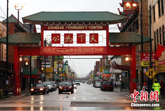 1月18日,芝加哥唐人街著名的标志性建筑中式牌楼上,提前挂起了“热烈欢迎胡锦涛主席访问芝加哥”的横幅。中新社记者 魏晞 摄