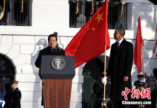 中国国家主席胡锦涛当地时间19日上午来到白宫南草坪,出席美国总统奥巴马为他举行的隆重欢迎仪式。