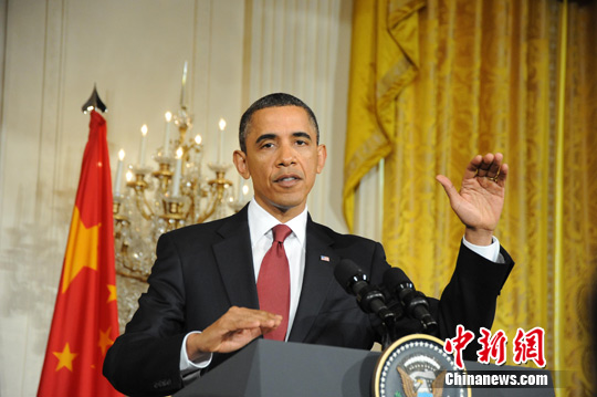 1月19日,中国国家主席胡锦涛同美国总统奥巴马在白宫共同会见记者。图为美国总统奥巴马回答记者提问。 中新社发 吴庆才 摄