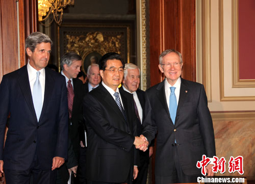 当地时间1月20日,中国国家主席胡锦涛在华盛顿国会大厦会见美国参议院多数党领袖里德。