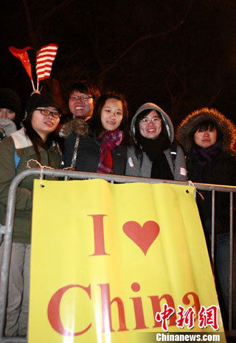 1月20日,约有3000华人华侨在胡锦涛主席抵达芝加哥车队行经的密歇根大道两边,夹道欢迎胡锦涛主席访问芝加哥。 中新社发 魏晞 摄