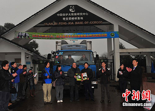 20日下午17时16分,装有大熊猫“比力”和“仙女”的大货车,由警车开道,缓缓驶离家乡雅安碧峰峡基地,经高速公路前往成都双流国际机场,踏上了旅居日本的道路。