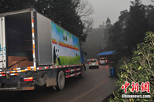 装有赴日大熊猫的货车由警车开道离开雅安。安源 摄