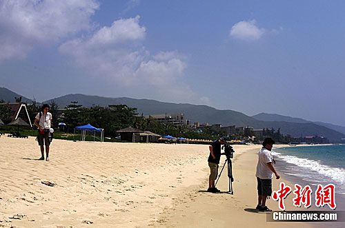 4月13日,随同俄罗斯总统梅德韦杰夫到中国海南省三亚出席“金砖峰会”的俄罗斯记者在风景如画的亚龙湾海滨拍摄外景。金砖国家领导人第三次会晤将于14日在这里举行,中国国家主席胡锦涛与巴西、俄罗斯、印度以及南非的国家领导人将出席。中新社发 任晨鸣 摄