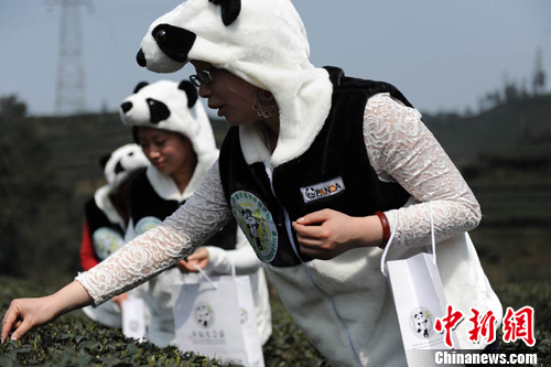 参与互动(0) 3月17日,环保汉字熊猫书画家、“熊猫茶”创始人安琰石带领一群身穿“熊猫衣服”的采茶姑娘在四川雅安开始了“熊猫茶”的首次采选。张浪 摄