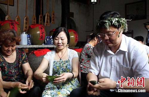 19日上午,独具屈乡特色的端午习俗展演在秭归凤凰山脚景贤门前拉开序幕,制作香袋、包粽子、涂抹雄黄酒、用艾水为儿童洗澡等多项纯正的民俗表演一一展现。图为端午节,秭归家家户户包粽子,送粽子,吃粽子。刘良伟 摄