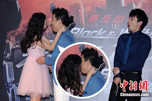 6月20日,由蔡岳勋执导,黄渤、赵又廷、Angelababy、关颖等主演的动作喜剧大片《痞子英雄之全面开战》在北京举行首映嘉年华造势。图为关颖主动献吻黄渤,惊呆赵又廷。中新社发 李学仕 摄