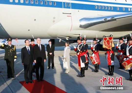 当地时间6月23日中国总理温家宝乘专机抵达阿根廷首都布宜诺斯艾利斯,开始对阿根廷进行正式访问,这是中国总理时隔27年后再次访问阿根廷。图为,阿政府高级官员在机场举行仪式欢迎温家宝一行。中新社发 郭金超 摄