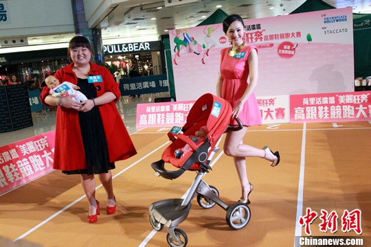2月13日,艺人高海宁与陈嘉佳在一家商场出席一项“美丽狂奔”高跟鞋赛跑新春活动。两人分别手推婴儿车怀抱婴儿为活动揭幕。