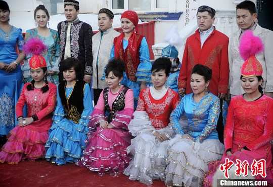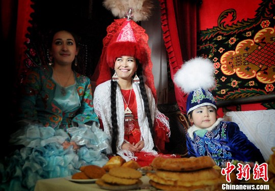 2月12日拍摄于新疆阿勒泰市拉斯特乡,哈萨克族男子服装宽大结实,便于骑马和放牧;哈萨克族女性服饰色彩艳丽,样式繁多。图为哈萨克族新娘服饰(中)。马新龙 摄