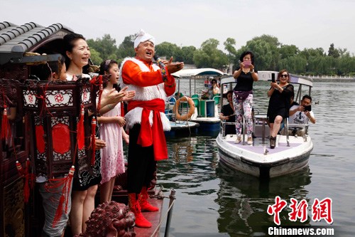 6月29日,一曲曲经典革命歌曲从北京什刹海野鸭岛码头传出,歌声吸引居民和游客加入到演唱者的行列中。演唱者武国举作为中国红色文化传播形象大使,带领什刹海街道后海西沿社区数百名居民齐声歌唱。据介绍,武国举自幼喜欢唱歌并天生拥有好嗓音,参加过多次大型歌唱活动。野鸭岛岛主曲喜圣也表示,野鸭岛目前在国内外都是人们所熟知的著名生态保护场所,借唱响经典歌曲这一活动,体现社会责任、赞美幸福生活。图为游客用手机拍摄武国举演唱歌曲。中新社发 任海霞 摄