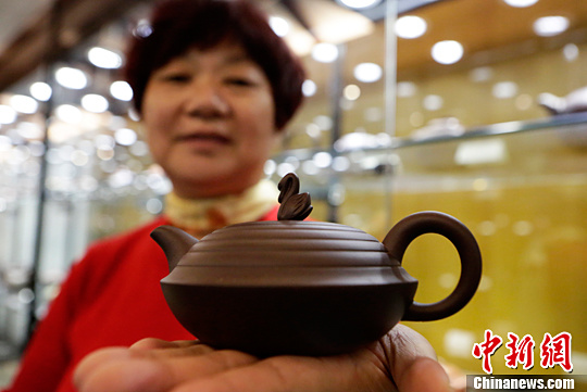 图为顾秀娟展示其紫砂壶作品“嬉水”。 中新社记者 李慧思 摄