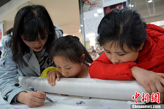 参加培训者学习简化蜀绣的第一步“二三针”,该针法为是两长两短,适用于小面积的部位。 胡敏 摄