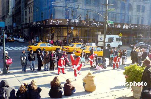 圣诞节即将来临,纽约街头到处都洋溢着浓郁的节日气氛。图为十二月七日,在曼哈顿街头一群身穿圣诞老人服装的年轻人在表演街舞,引来不少路人驻足观看。中新社发 邓悦 摄