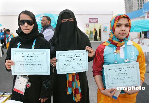 多哈当地时间十二月十五日下午,第十五届亚运会各项赛事相继结束,主办者向为各项赛事提供服务的志愿者颁发奖状和纪念品。中新社发 毛建军 摄